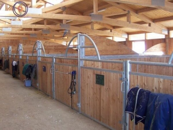 Für beste Trainingsmöglichkeiten sorgt die zum Hof gehörende 20m x 40m große Reithalle. Der hochwertige Hallenboden, bestehend aus einer Mischung aus Reitsand und Fleece, wird täglich gepflegt. Ausgestattet mit einer guten Beleuchtung, Spiegeln und einer automatischen Bewässerungsanlage, können die Pferde hier bei jedem Wetter ausreichend bewegt werden. Die Windnetze an den drei offenen Hallenseiten sorgen für Helligkeit sowie eine gute Belüftung und schützen im Sommer vor Hitze und Fliegen, im Winter vor Schnee und Kälte.